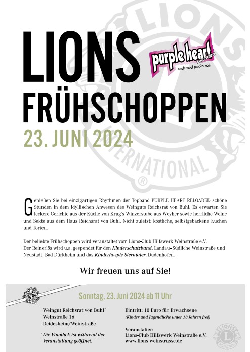 Am Sonntag, den 22. Juni 2025 um 11:00 Uhr lädt der Lionsclub Weinstraße zu seinem legendären Frühschoppen nach Deidesheim in das Weingut Reichsrat von Buhl ein.